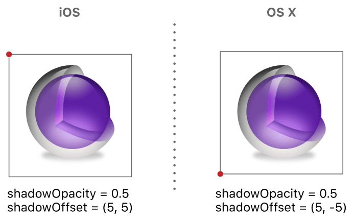 by default, which effectively hides the shadow. Changing the opacity to a nonzero value causes Core Animation to draw the shadow. Because shadows are positioned directly under the layer by default, you might also need to change the shadow’s offset before you can see it. It is important to remember, though, that the offsets you specify for the shadow are applied using the layer’s native coordinate system, which is different on iOS and OS X. Figure 2-5 shows a layer with a shadow that extends down and to the right of the layer. In iOS, this requires specifying a positive value for the y axis but in OS X the value needs to be negative.
