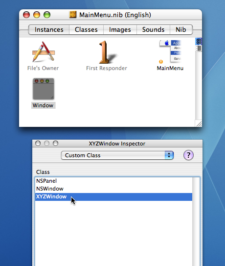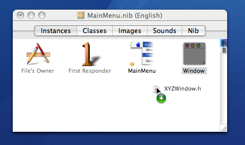 file in Interface Builder as shown in Figure 3. As an alternative to using drag and drop, you could select "Read Files ..." from the "Classes" menu in Interface Builder and explicitly choose "XYZWindow.h