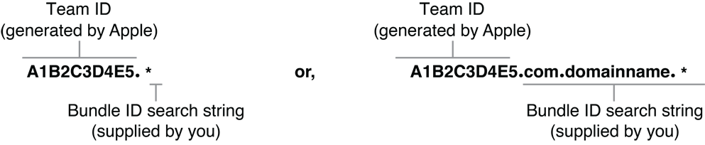 A wildcard App ID contains an asterisk as the last part of its bundle ID search string. The asterisk replaces some or all of the bundle ID in the search string.