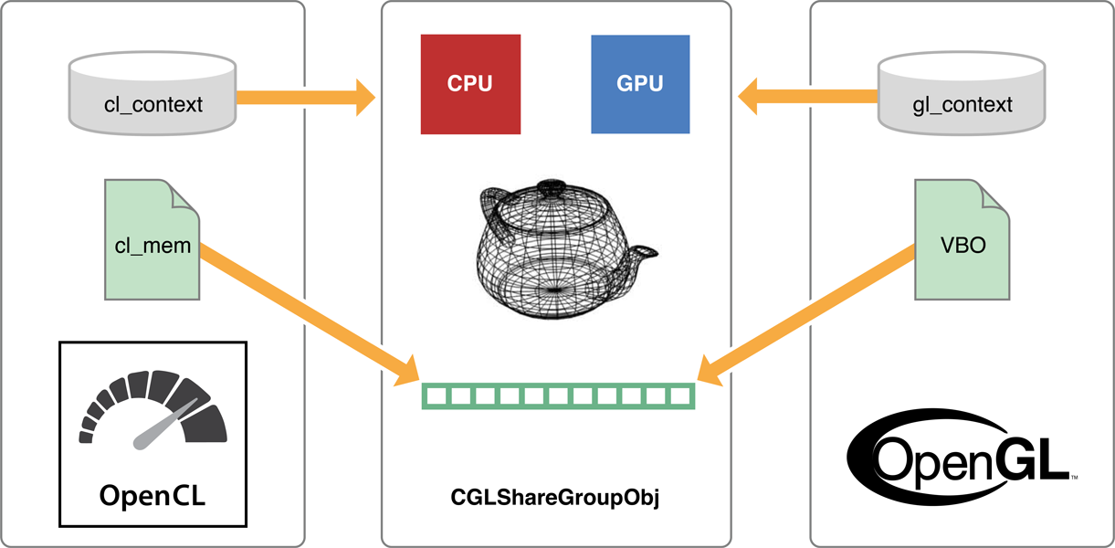 . The result is that both the OpenCL and OpenGL contexts end up referencing the same sharegroup (CGLShareGroupObj) object, see the same devices, and access this shared geometry.