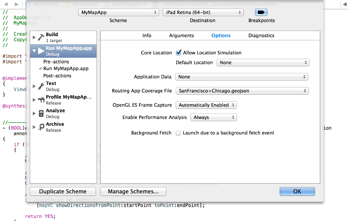 It’s a good idea to test your GeoJSON file before uploading it to App Store Connect. During development, use the scheme options of your Xcode project to specify a geographic coverage file to test. When you run your app in the simulator, Xcode transfers this file to the simulator or device so that the Maps app knows about the regions your app supports.