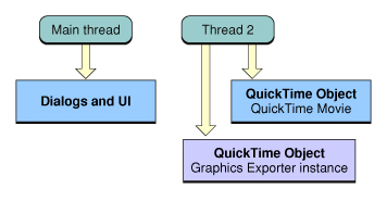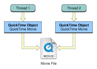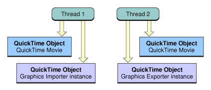 Independent threads in your application can safely use logically disjoint sets of QuickTime objects from multiple threads. If one thread has its own unique set of QuickTime objects and another thread has its own unique set, then any operation performed on these objects can be considered thread-safe. The two threads must have no QuickTime objects in common. See Figure 1.
