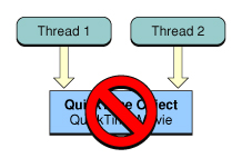 Conversely, if two threads access the same QuickTime object or objects simultaneously, then any operation performed on these objects is not considered thread-safe. The threads manipulating these objects are required to perform their own synchronization (or locking) around any object access. This is no different from any unprotected (or global) data structure that needs to be accessed from multiple threads. Some kind of thread protection must be implemented before allowing simultaneous access. See Figure 2.
