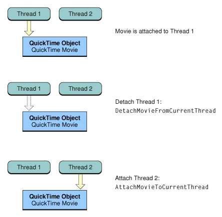 QuickTime Movies on the other hand must know which thread they belong to at any given time. There are two APIs that must be called whenever moving a QuickTime Movie from one thread to another. You must first detach a Movie from the old thread then attach it to the new thread.
