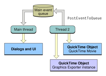 In cases such as this, you may need to re-think your progress callbacks to make them thread-safe. One very useful technique is to use custom carbon events sent from the progress callback on a background thread to a carbon event handler on the main thread. This can be accomplished by using the thread-safe API PostEventToQueue from a background thread. See Figure 6.