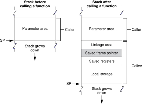 The IA-32 environment uses a stack that—at the point of function calls—is 16-byte aligned, grows downward, and contains local variables and a function’s parameters. Each routine may add linkage information to its stack frame, but it’s not required to do so. Figure 1 shows the stack before and during a subroutine call. (To help prevent the execution of malicious code on the stack, GCC protects the stack against execution.)