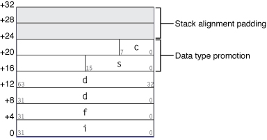 Figure 2 illustrates the placement of arguments in the parameter area at the point of the function call. Note the padding added to align the stack at 16 bytes.