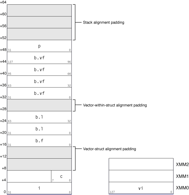 The caller places structures with vector elements on the stack, 16-byte aligned. Each vector within the structure is 16-byte aligned.