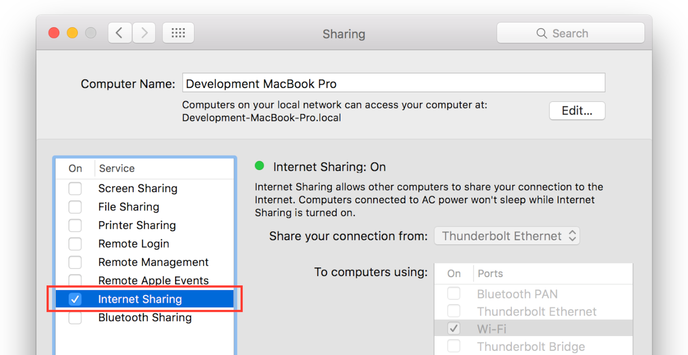 Choose the network interface that provides your Internet connection, such as Thunderbolt Ethernet.
