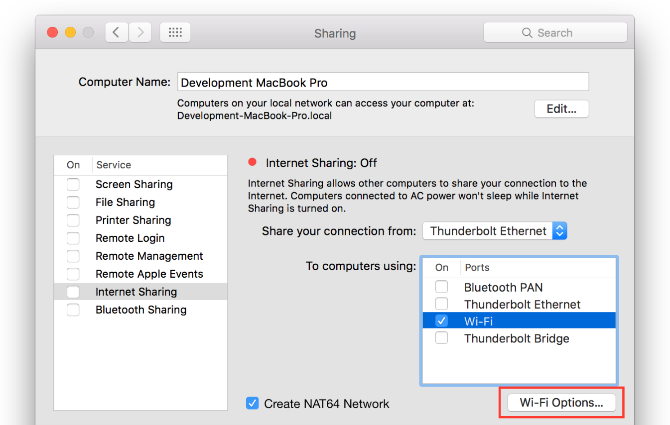 Once sharing is active, you should see a green status light and a label that says Internet Sharing: On. In the Wi-Fi menu, you will also see a small, faint arrow pointing up, indicating that Internet Sharing is enabled. You now have an IPv6 NAT64 network and can connect to it from other devices in order to test your app.