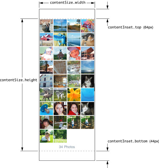 property results in an additional buffer area that is 64 pixels at the top of the content (20 pixels for the status bar and 44 pixels for the navigation controller) and 44 pixels at the bottom (the height of the toolbar). Setting contentInset