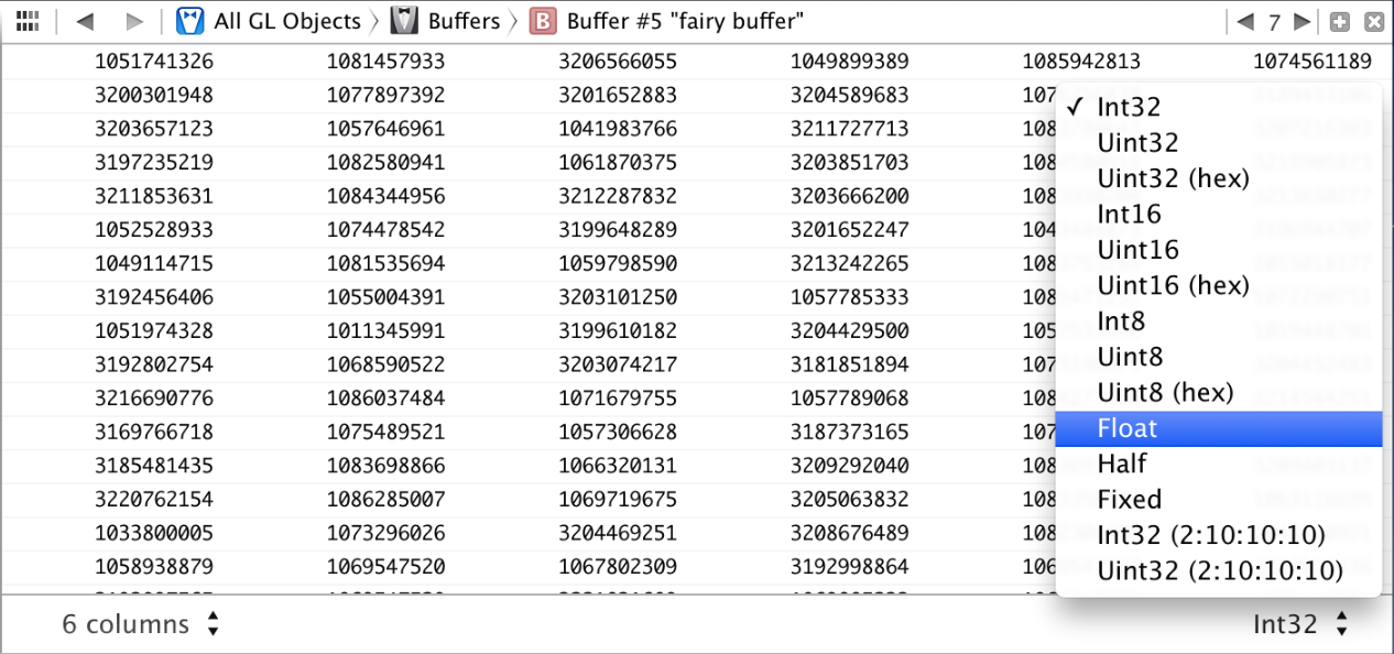 When you inspect an array buffer, the assistant editor shows the contents of the buffer (see Figure B-9). Because a buffer in OpenGL ES memory has no defined format, you use the pop-up menus at the bottom of the editor to choose how its contents appear (for example, as 32-bit integers or floating-point values, or as twice as many 16-bit integers or half-float values), and how many columns Xcode uses to display the data.