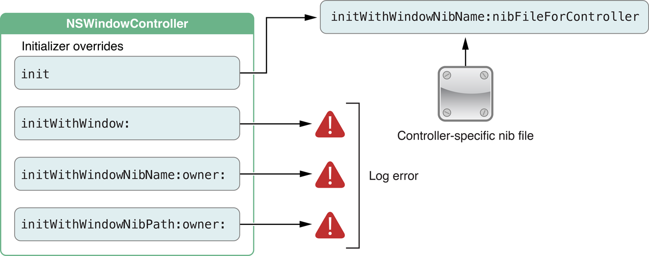 This problem is solved by overriding the init method to call the superclass’s initWithWindowNibName: method with the correct nib name. Then instantiators just use init, and the controller has the correct nib file. You can also override the initWithWindowNib... methods to log an error, as shown in Figure 2-4, because no instantiator should ever try to tell your subclass which nib file to use. It is a good idea for any NSWindowController subclass designed to work with a specific nib file to use this technique. You should do otherwise only if you are extending just the basic functionality of NSWindowController in your subclass and have not tied that functionality to any particular nib file.