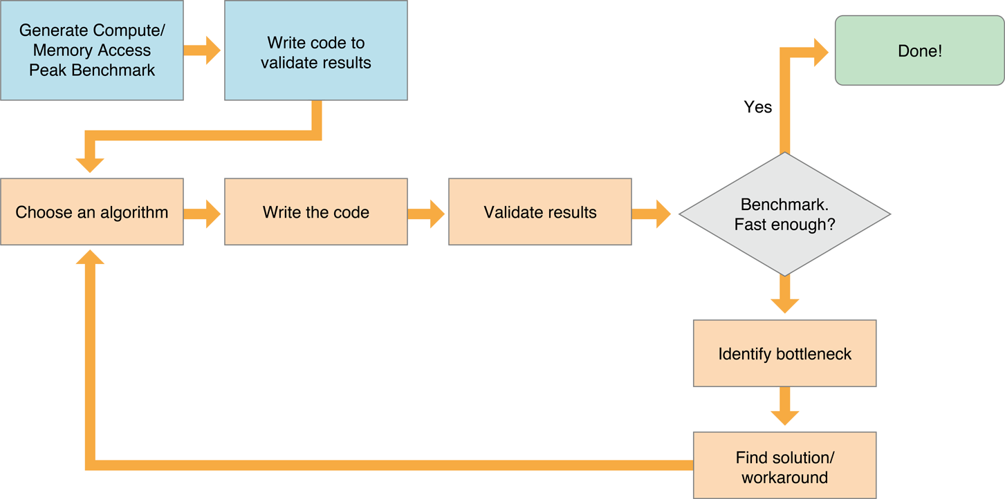 Figure 14-6 shows a typical process for optimizing a kernel that runs efficiently on the GPU: