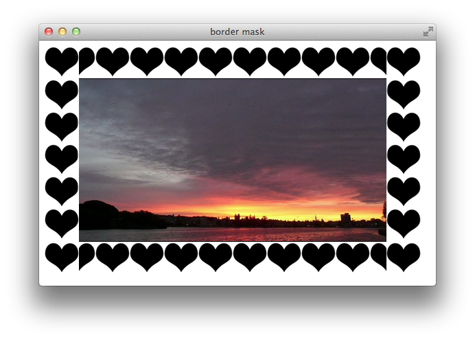 parameters. You can specify offsets into the mask image to slice it into top, right, bottom, and left images, applying the mask slices, stretched or repeated, to the edges of an element. For example, the following snippet uses a 50-pixel heart-shaped mask and adds a 50-pixel border to the image. The snippet also adds parameters to the -webkit-mask-box-image
