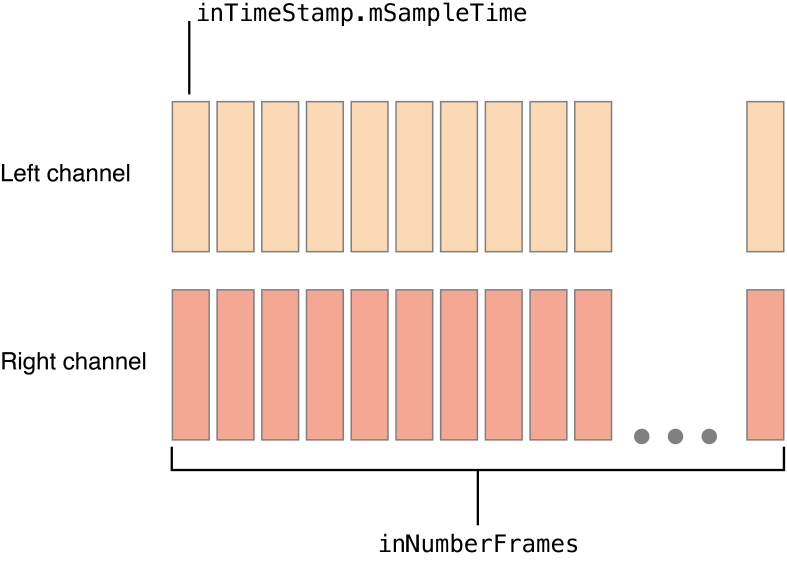 structure, whose mSampleTime field is a sample-frame counter. On each invocation of the callback, the value of the mSampleTime field increments by the number in the inNumberFrames parameter. If your app is a sequencer or a drum machine, for example, you can use the mSampleTime value for scheduling sounds.