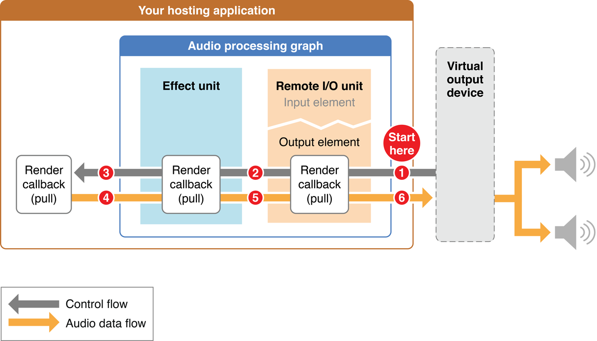 Similarly, the loudspeakers in the figure represent the output audio hardware. The system determines the output hardware’s stream format and imposes it onto the output scope of the Remote I/O unit’s output element.