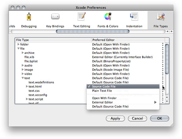 To change the editor type for a particular file type, choose the the editor type from the Preferred Editor pop-up menu of the file type. For example, to make Xcode let you edit HTML files—except documentation—in the text editor as source code, choose Source Code File from the Preferred Editor pop-up menu for the file/text/text.html file type, as shown in Figure 3-2.