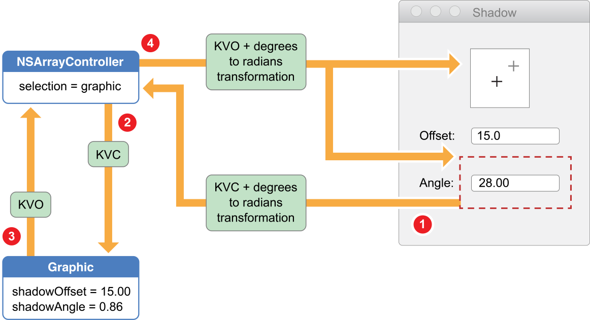 shadowAnglevariable.Through KVO, the controller informs the joystick and the angle text field that an update has been made to its content’s