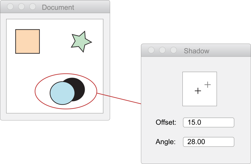 To understand how these technologies work together, consider a drawing application that allows the user to draw graphic objects such as circles and rectangles on screen. Among other properties, a graphic object has a shadow that may be offset a variable distance from the center of the graphic at an arbitrary angle. An inspector displays the offset and angle of the selected graphic object’s shadow in a pair of text fields and a custom view—a joystick—as shown in Figure 1.