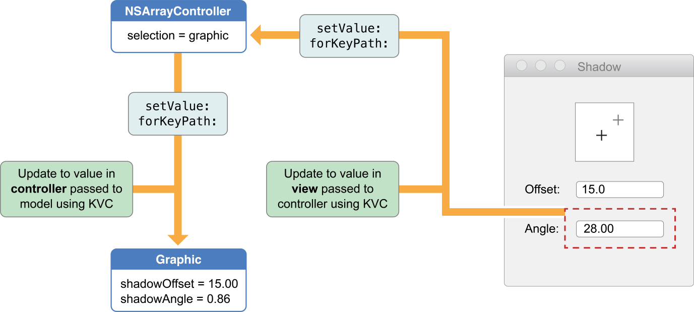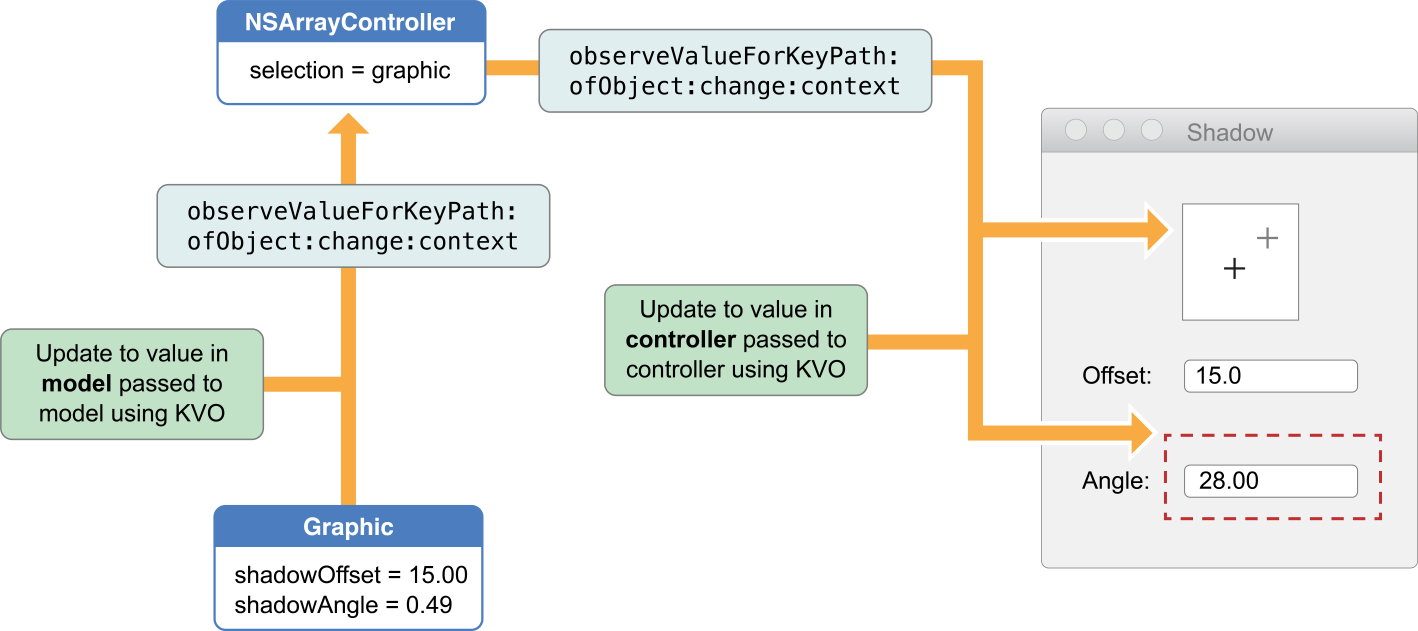 An observed object communicates changes directly to observers by sending them an observeValueForKeyPath:ofObject:change:context: message (defined by the NSKeyValueObserving informal protocol)—there is no independent notifier object akin to NSNotificationCenter. Figure 5 illustrates how a change to a model value (the shadow angle) is communicated to views using KVO.