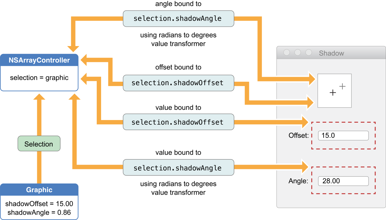 withKeyPath: @"selection.shadowAngle"using any of these options that may be appropriate.