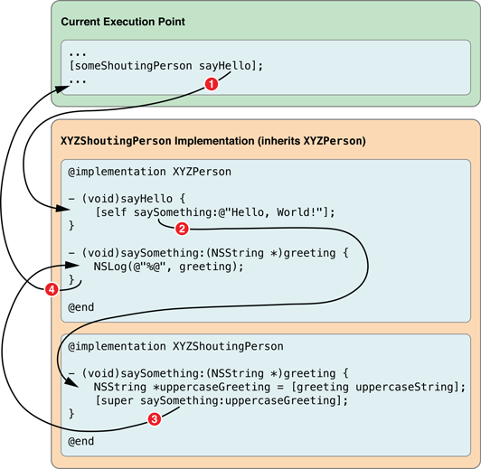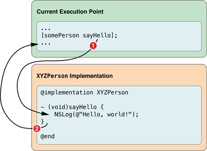 Sending an Objective-C message is conceptually very much like calling a C function. Figure 2-1 shows the effective program flow for the sayHello message.