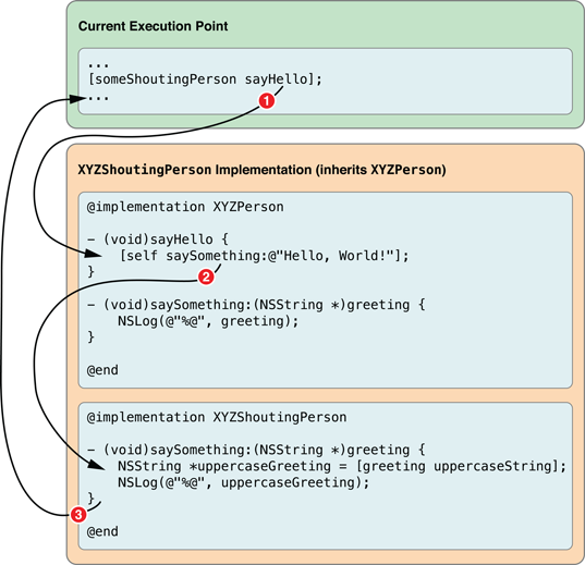 Because sayHello is implemented by XYZPerson, and XYZShoutingPerson is set to inherit from XYZPerson, you can call sayHello on an XYZShoutingPerson object as well. When you call sayHello on an XYZShoutingPerson, the call to [self saySomething:...] will use the overridden implementation and display the greeting as uppercase, resulting in the effective program flow shown in Figure 2-3.