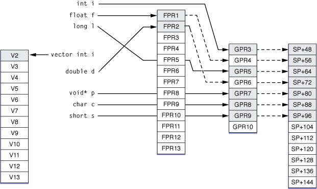 Bytes 48 through 112 of the parameter area correspond to the general-purpose registers GPR3 through GPR10. When data is placed in a general-purpose register and not duplicated in the parameter area, the corresponding section in the parameter area is reserved in case the called subroutine needs to copy the value in the register to the stack. Table 3 shows the correspondence of parameter-area locations to the general-purpose registers that can be used to pass parameters.