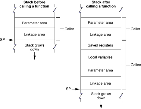 The calling routine’s stack frame includes a parameter area and some linkage information. The parameter area has the arguments the caller passes to the called subroutine or space for them, depending on the type of each parameter and the availability of registers (see Passing Arguments for details). Since the calling routine may call several subroutines, the parameter area must be large enough to accommodate the largest argument list of all the subroutines the caller calls. It is the calling routine’s responsibility to set up the parameter area before each function call. The called function is responsible for accessing the arguments placed in the parameter area.