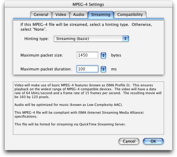 .mp4file or a QuickTime.movfile using MPEG-4 compression. This allows you to mix MPEG-4 audio and video with other QuickTime media, such as VR panoramas, sprites, or Flash tracks. Discussed in the section MPEG-4 and Web Developers.A new group of MPEG-4 settings dialogs in QuickTime Player that enable QuickTime Pro users who work with MP4 files to make a number of adjustments in video and audio tracks, streaming and compatibility. Discussed in the section Working with MPEG-4 Files.