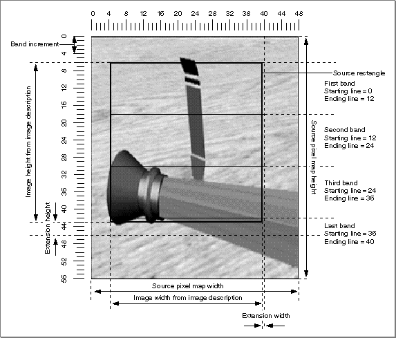 Occasionally a compressor component may not be able to accommodate the destination rectangle for an image decompression or the source for an image-compression operation. This situation may result from compressors that are optimized to work at certain depths or that cannot perform scaling, translation, dithering, or masking during decompression. In such circumstances the Image Compression Manager allocates a temporary buffer that is acceptable to the compressor component and breaks the image up to fit into that new buffer. Since there often is not enough memory to allocate a buffer to hold the entire image, the Image Compression Manager may allocate one that holds a band of the image. A band is one horizontal piece of the image. Its height is some portion of the desired image height (before scaling or rotation), and it is at least as wide as the desired image.