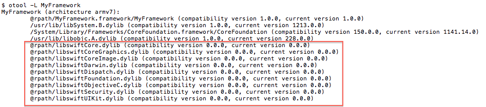 A: Swift standard libraries are copied into a bundle if and only if you are building an application and this application contains Swift source files by itself. You can check whether a product such as a framework includes Swift source files by running otool -L on its executable in the Terminal. This command displays all shared libraries and frameworks that your product dynamically links against. Your product uses Swift if any of the Swift libraries appear among the result of otool -L as shown in Figure 1.