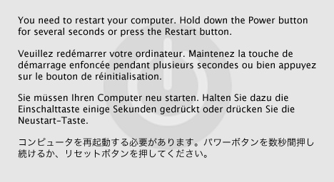 A panic is typically indicated by the multi-lingual panic alert shown in Figure 1. After restarting the system, a log file named with the date and time of the panic should be present in /Library/Logs/PanicReporter. (Prior to Mac OS X 10.5 Leopard, this log is /Library/Logs/panic.log.) The panic log contains information about the state of the machine at the time of the panic. Starting with Mac OS X 10.4 Tiger, after restarting the system, the user will be given an opportunity to send this panic log to Apple. To protect a user’s privacy, the only information transmitted to Apple are the panic log, a simple hardware description without identifying IP address, and any user comments.