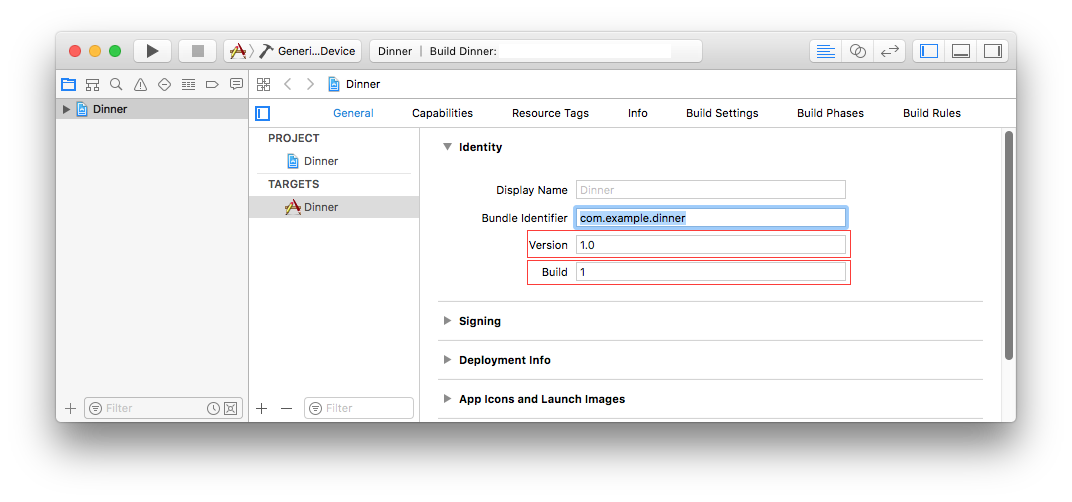 Enter a version number (CFBundleVersion) and a build number (CFBuildNumber) in the Version and Build fields of your Target's General Pane in Xcode, respectively as seen in Figure 4.