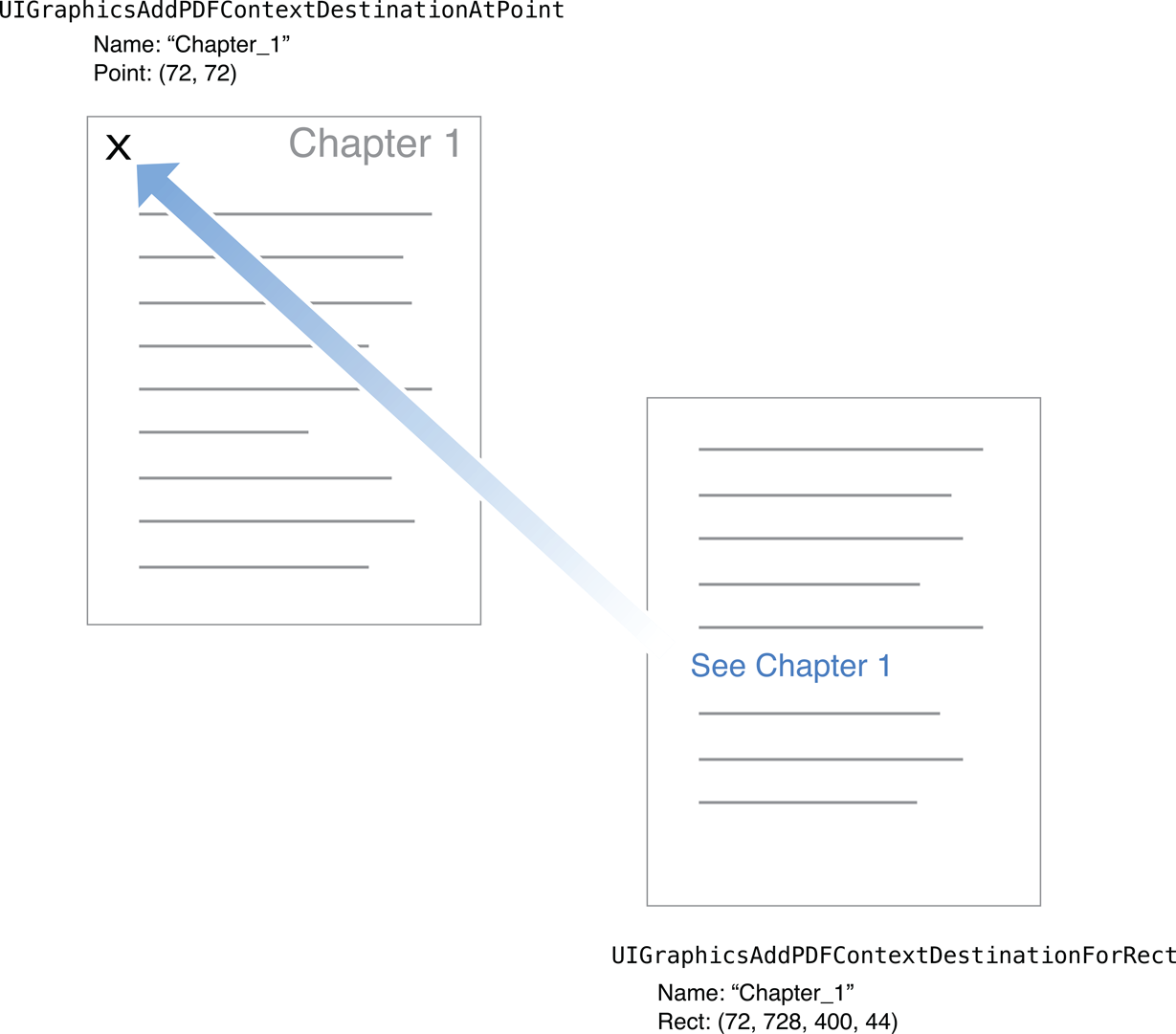 function to specify the source rectangle for the link. Figure 4-1 shows the relationship between these two function calls when applied to the pages of your PDF documents. Tapping on the rectangle surrounding the “see Chapter 1” text takes the user to the corresponding destination point, which is located at the top of Chapter 1.