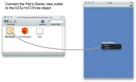 subclass’s view outlet to the scroll view. Figure 1-1 shows the connection, assuming that the File’s Owner is the UIViewController