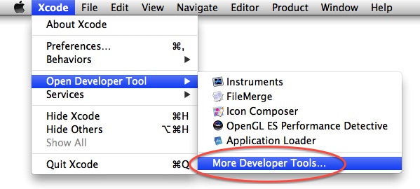 Other standalone utility applications and add-on technologies. Several additional tools are no longer part of the default Xcode installation, they are now downloadable as separate packages. The More Developer Tools menu command (Figure 5) provides a direct jump to developer.apple.com/downloads in Safari where these development tools can be found.