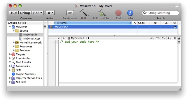 1. Open MyDriver.cpp in your project’s Source folder. The default file contains no code.