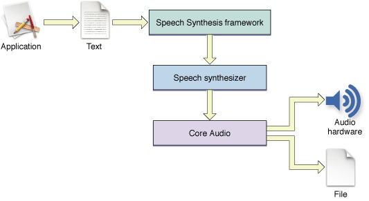 As outlined in Figure 1-1, your application initiates speech generation by passing a string or buffer of text to the Speech Synthesis framework, via the appropriate API. The Speech Synthesis framework is responsible for sending the text to a speech synthesizer, a component containing executable code that manages all communication between the Speech Synthesis framework and Core Audio.