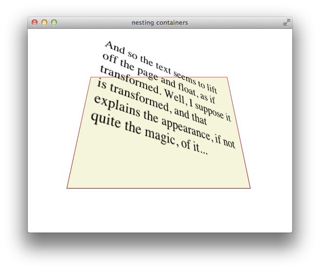 The following listing illustrates several of the points covered in Working with Transforms in JavaScript. The result is illustrated in Figure 7-16.