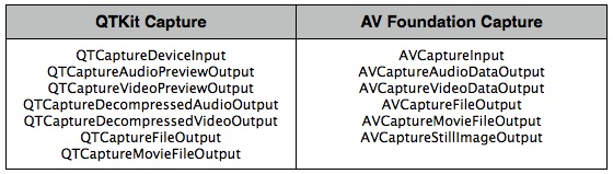 AV Foundation also provides a full suite of capture APIs that give you full access to the camera and provide for flexible output. The classes that make up the AV Foundation capture APIs closely resemble those in QTKit.