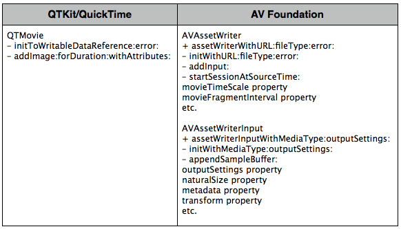 AV Foundation is the recommended framework for all new development involving time-based audiovisual media on iOS and OS X. AV Foundation is also recommended for transitioning existing apps based on QTKit. Introduced in OS X 10.4, QTKit provides a set of Objective-C classes and methods designed to handle the basic tasks of playback, editing, export, audio/video capture and recording, in addition to a number of other multimedia capabilities.