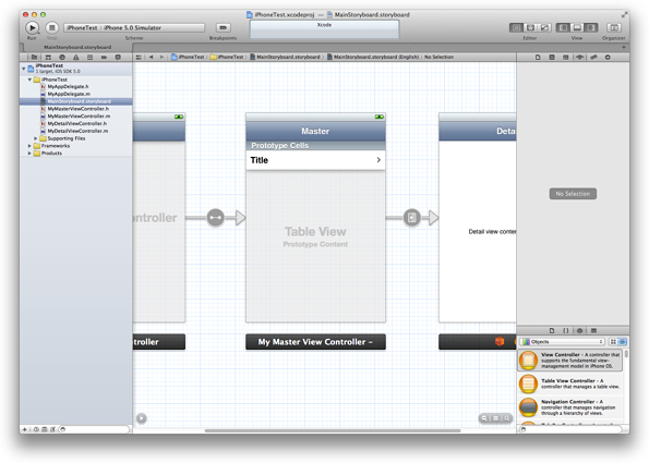 As described in Creating a Table View Using a Storyboard, the template includes stub code and a storyboard defining an app delegate, the navigation controller, and the master view controller (which is an instance of a custom subclass of