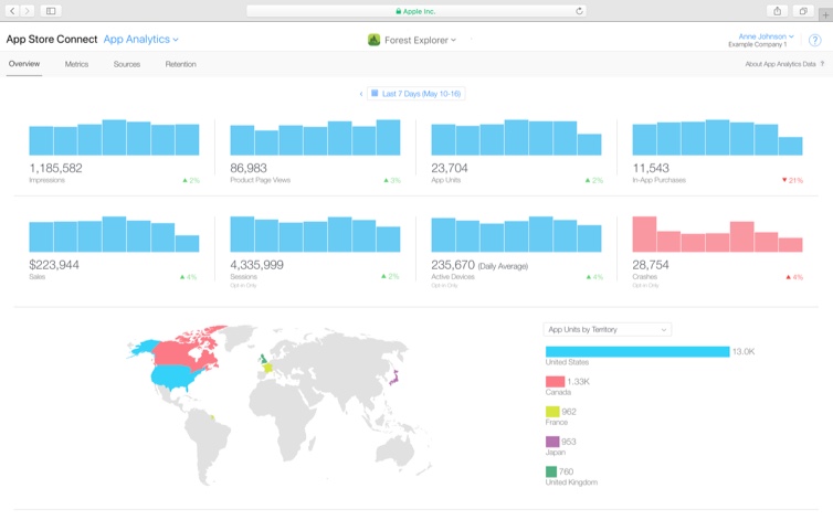 Measure user engagement, marketing campaigns, and monetization for your iOS apps and tvOS apps with App Analytics on iTunes Connect. App Analytics has data you won’t find anywhere else and requires no technical implementation. Learn more about App Analytics