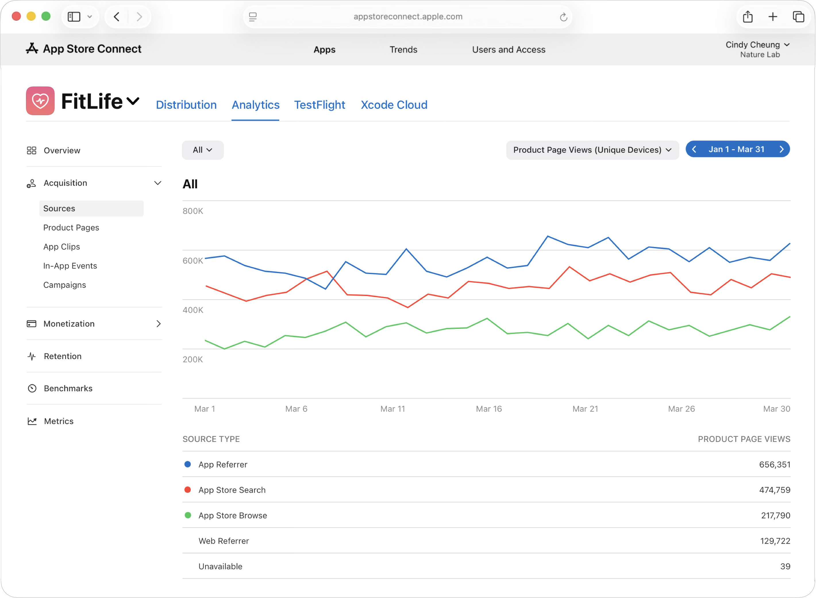 你可以使用 App Store Connect 中的「分析」來瞭解哪些獲取來源有效提升 App 的曝光度和優質下載次數。具體來說,你可以使用「分析」檢視有多少使用者透過各種途徑探索並下載你的 App,包括 App Store 搜尋、App Store 瀏覽、App 推薦連結、網頁推薦連結和自訂行銷宣傳活動。