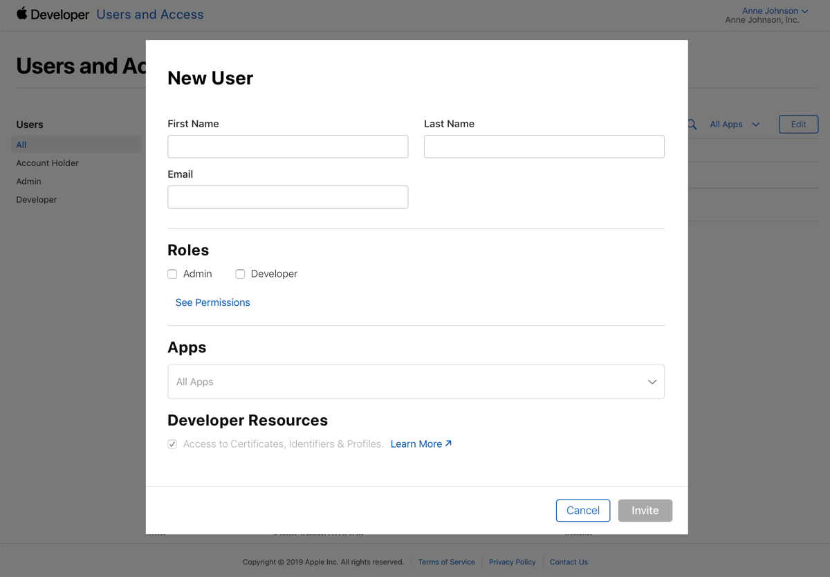 1. 开发者账户的顶部导航栏中,点按“计划资源”。在“其他资源”下方,点按“用户和访问”。