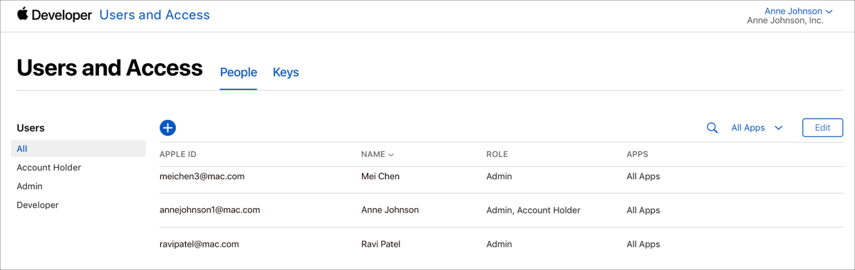 组织可以选择向自己的开发团队中添加其他用户。如果你注册的是 Apple Developer Program,可在 App Store Connect 中管理团队成员。有关详细信息,请访问《App Store Connect 帮助》中的“添加和编辑用户”。