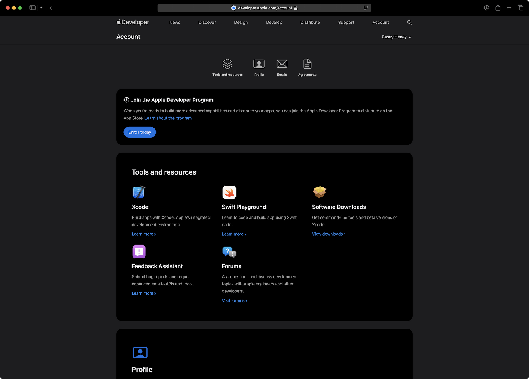 If you sign in to your Apple Account on the Apple Developer website or in the Apple Developer app, you’ll be prompted to accept the Apple Developer Agreement. Once you’ve agreed, you’ll be registered with Apple as a developer, and can access development tools and resources.
