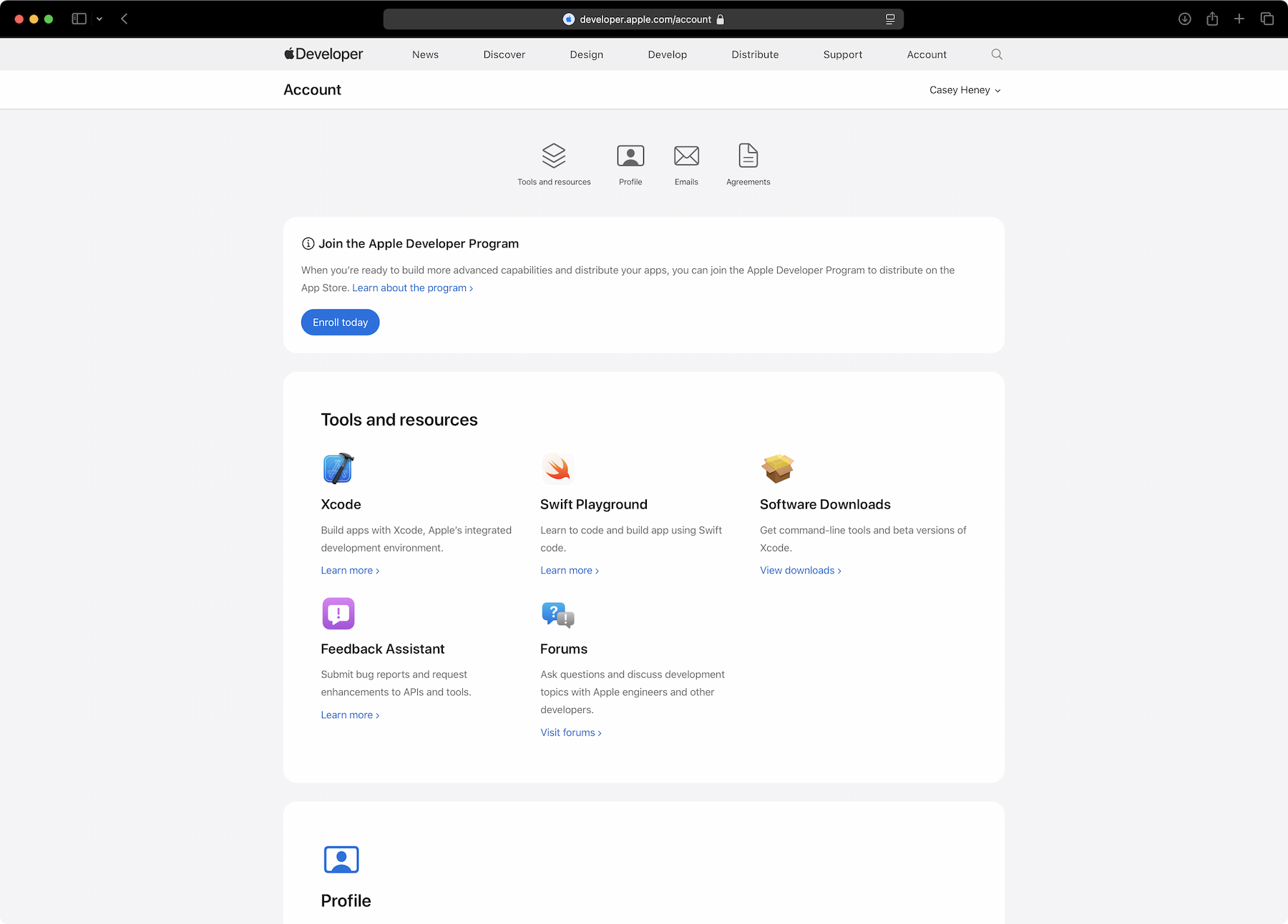 The sections shown in your account depend on whether you’ve registered for free or are enrolled in a paid program (the Apple Developer Program or Apple Developer Enterprise Program). If you’ve been added to a team, the actions you can take in these sections depend on the roles you’ve been assigned.